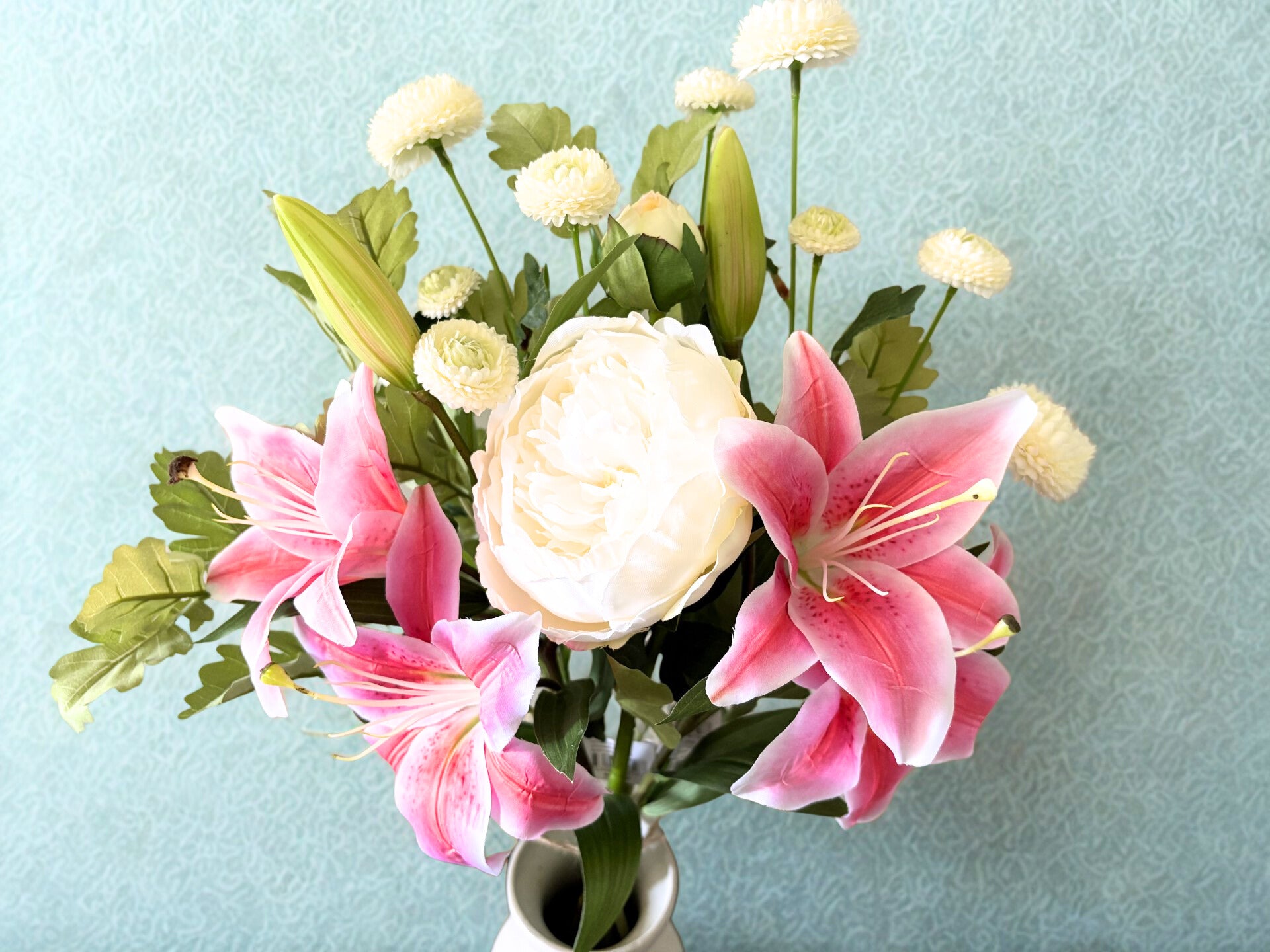 Vacker bukett av konstgjorda, verklighetstrogna blommor av högkvalitet från Mr Plant. Buketten består av en vit pion, två rosa liljor med två blommor på vardera kvist, två silverek och två vita chrysanthemum med flera blommor på varje kvist.