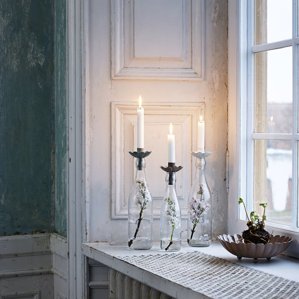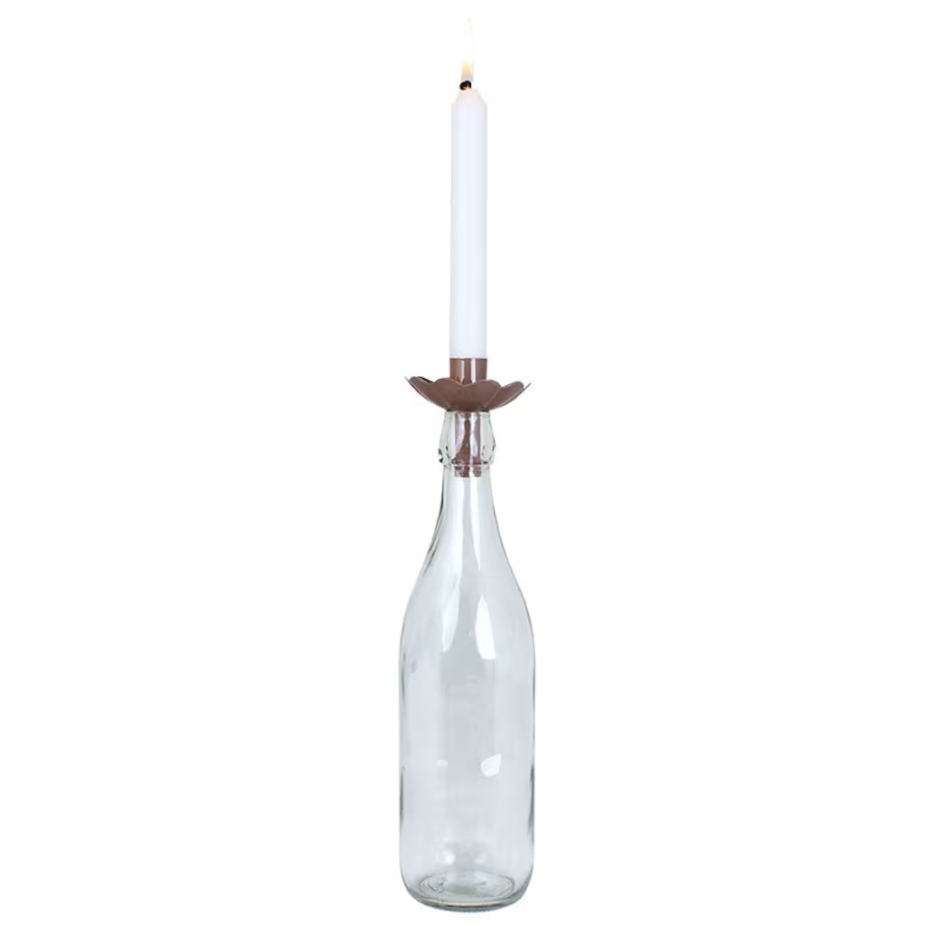 Rosa ljushållare med dekorativ kant att sätta i en tom flaska. Ljushållaren är handgjord i Indien och dess vågformade kanter är handklippta. Små variationer i färg och form kan förekomma.